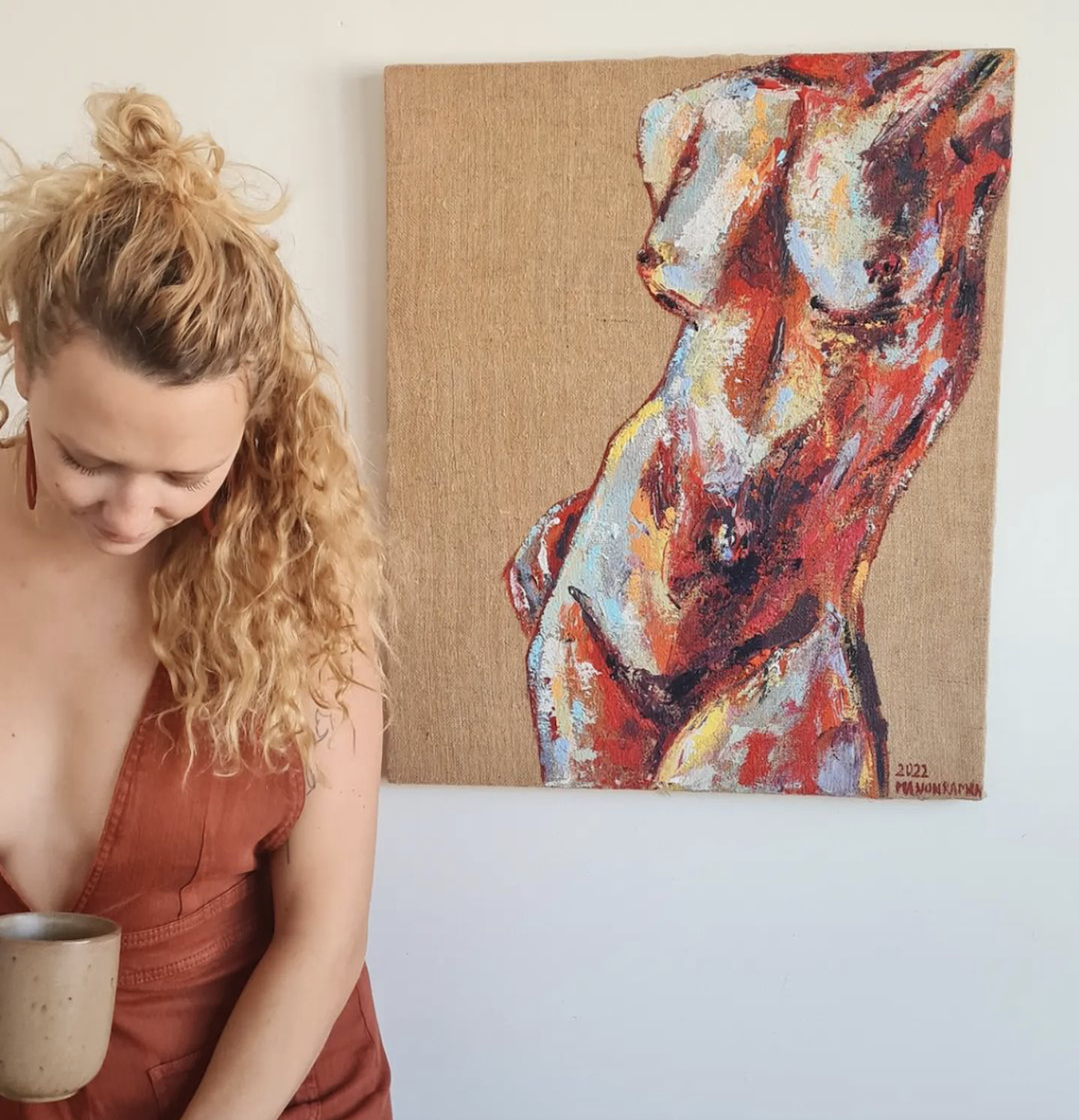 Manon Raman with one of her paintings on the wall. Photo Courtesy of Manon Raman. Credit: Manon Raman