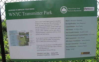 I visited Transmitter Park, located on Greenpoint Ave and the water, the day after its opening July 4th. It’s a wide open field with a fence closing off the water with tables generously spread throughout the area and woodchips strewn across the ground. There was a sign calling for volunteer gardeners where I proceeded to fantasize about turning the park into a beautiful urban forest or vegetable garden with a mural along the side of the brick building, sculptures dotted beside tables with a full schedule of summer events from movie screenings to music performances to massive picnics. But apparently this would be impossible to propose, as the park will be fully renovated starting in the Spring with a cafe, piers, a bird watching and child friendly area, tables, and an esplanade. The rezoning is old news by now, where people complained high rises were built with quickness while not a single park was yet to be opened. The conversion of WNYC’s transmitter center into a park is ingenious and starved for in Greenpoint and although the $10 million renovation is expected to start next year I’m very happy they’ve decided to open it to the public early.