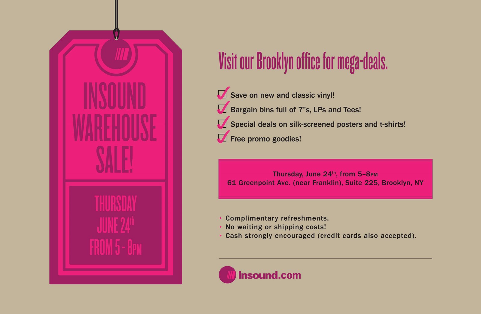 Online indie music retail mogul Insound is having one of their famous warehouse sales this Thursday at the company’s headquarters right here in Greenpoint. Normally, in order to shop at Insound, you need to do so online and eagerly wait for your goodies to arrive in the mail. Only a couple times a year does Insound open up their offices to the public and offer deals so that you can walk home with those sought-after records, t-shirts, and silk-screened posters immediately. No waiting! Plus, they will be offering complimentary refreshments and promo goodies.