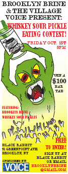 Calling all pickle freaks of New York! Next Friday October 1st, Brooklyn Brine and the Village Voice are hosting their 1st Annual Pickle Eating Contest at Greenpoint’s Black Rabbit. The challenge: be the first to devour six jars of Brooklyn Brine’s Whiskey Sour Pickle. That’s right, SIX JARS. The winner will walk away with $100 and surely some serious garlic breath.