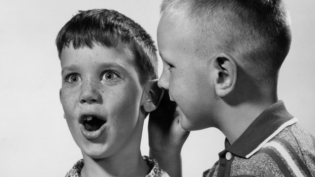 circa 1955: Studio headshot of one young boy whispering a secret in another boy’s ear, who looks surprised. There is a white backdrop. (Photo by Harold M. Lambert/Lambert/Getty Images)