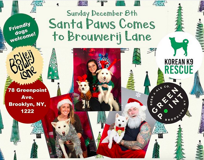 Get your doggy camera ready! This Sunday, Dec 8th bring your dog to Brouwerij Lane for a pic with Santa. All proceeds from Santa Paws portraits goes to Korean K9 Rescue whose dedicated work raises awareness about the dog meat trade. Korean K9 Rescue will have giveaways and raffle prizes from the maker’s of the finest hand made snacks and free samples @droolingmonsters. Stop by and mingle with other holiday pups to ring in the holiday cheer together!