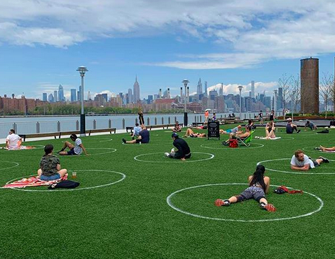 Domino Park debuts social distancing circles. (Image via Amanda Dombrowski)