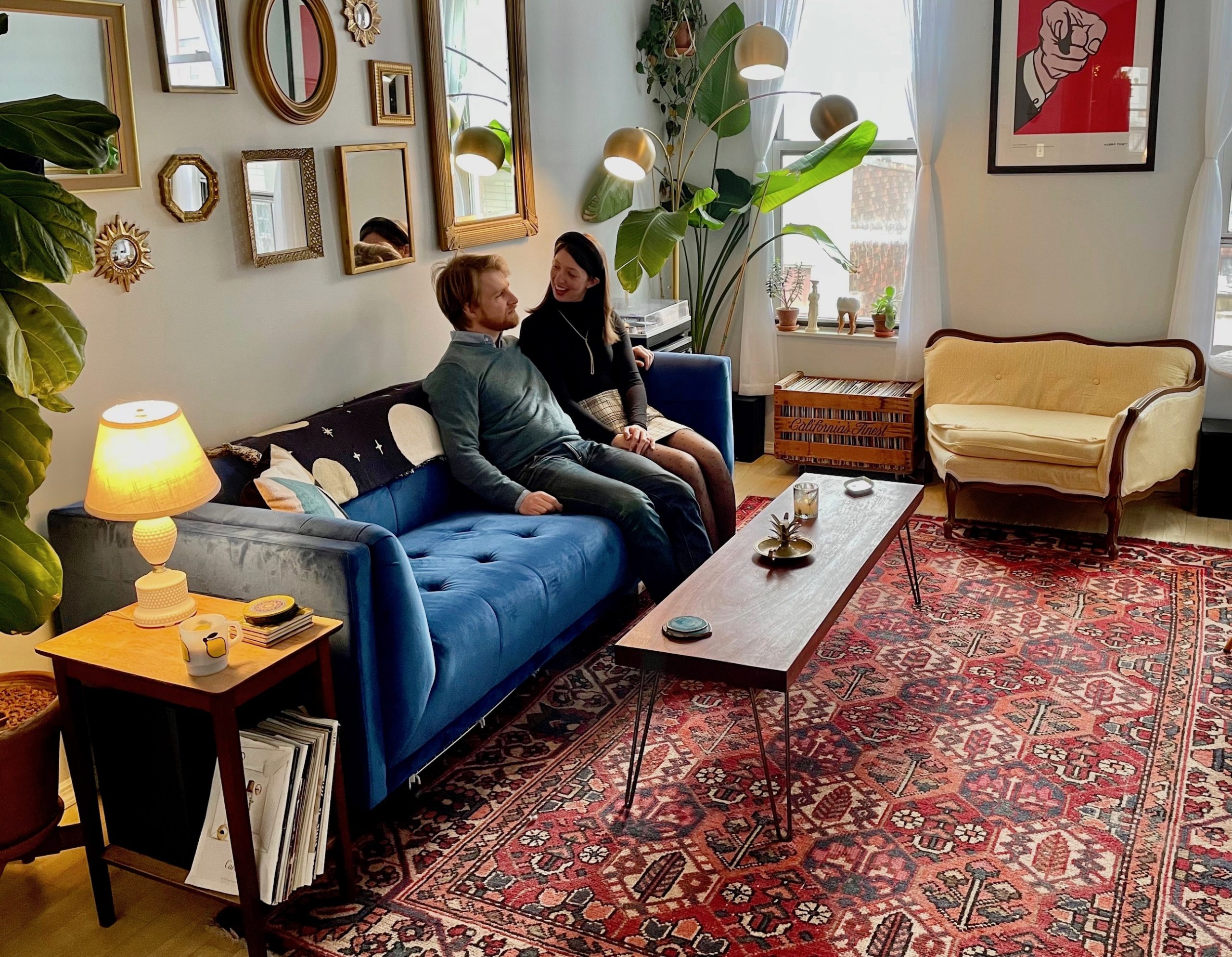 Evoking an old-timey tea parlor, the living room is decorated with an eclectic mix of brightly colored furniture and décor. A pale yellow loveseat sits perpendicular to a deep blue velvet couch, with the primary color palette completed by a large red 1908 Turkish rug in the center of the room. Fourteen rectangular, square, and round gold mirrors hang above the couch, and a large fiddle leaf fig and a towering bird of paradise sit next to the arms on either end.