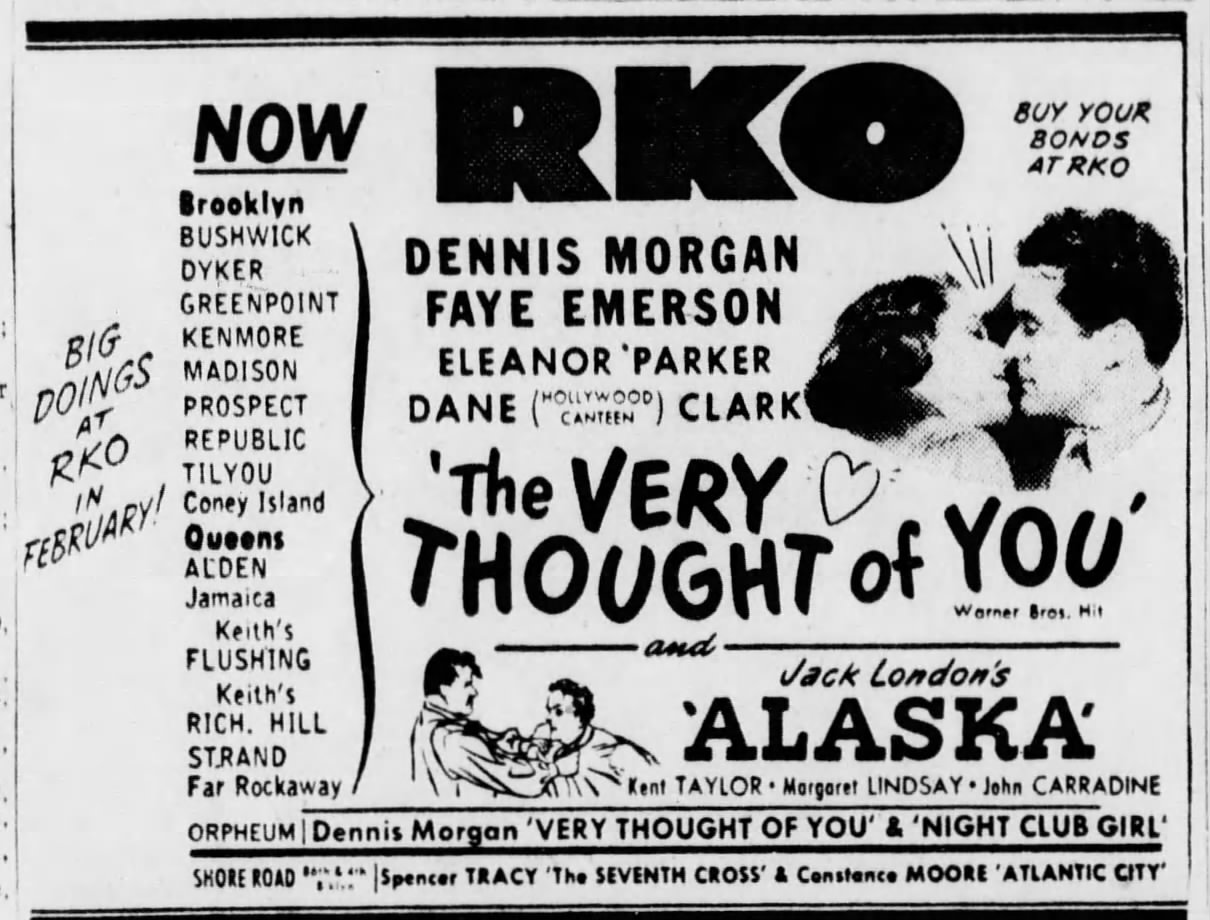 On this day in 1945, the RKO Greenpoint Theater was making way for a double feature of The Very Thought of You and Alaska, according to an advertisement in The Brooklyn Daily Eagle.