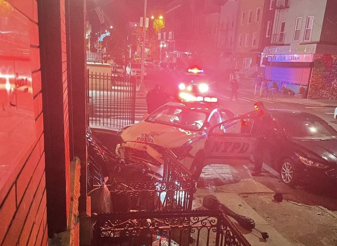 “The collision occurred on Saturday, February 19th at 3:58 a.m. Two of my officers assigned to patrol were involved in a collision at the corner of Meserole Avenue and Guernsey Street while responding to a possible commercial burglary. As the officers traveled west on Meserole, the motorist on Guernsey did not stop for the stop sign. As a result, the vehicle driven by my officer collided with a parked vehicle and the staircase of the building located at 73 Meserole, causing the staircase to collapse. The airbags deployed and both officers were treated at the hospital for non life threatening injuries. No other injuries were reported. Department of Buildings issued a vacate order for the building due to unsafe egress. A summons was issued for Failure to Stop at a Stop sign.”