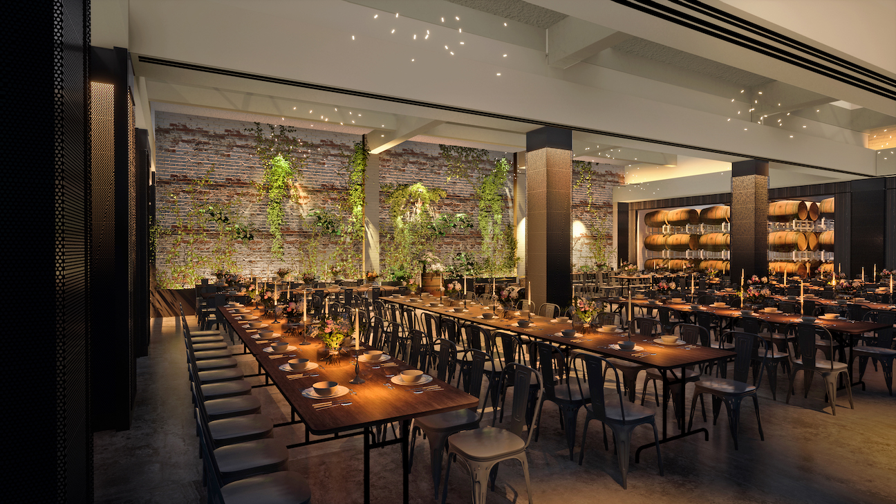 Renderings show a room filled with wine barrels enclosed by glass that will be used as a backdrop for wedding ceremonies and cocktail hours. The event space will be flexible and can be arranged to accommodate meetings, team-building activities, and holiday parties just like the current location.