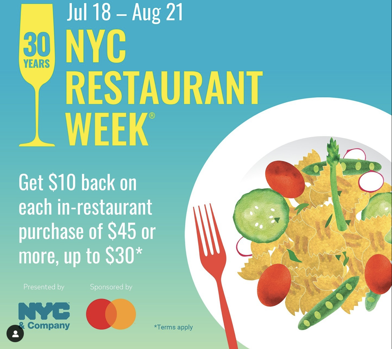 For folks with Mastercard, when you register your Mastercard and use it at a participating restaurant during NYC Restaurant Week, you’ll earn a $10 statement credit on each in-person dining transaction of $45 or more. There is a three-meal ($30) redemption limit per customer. The offer is valid until July 31.