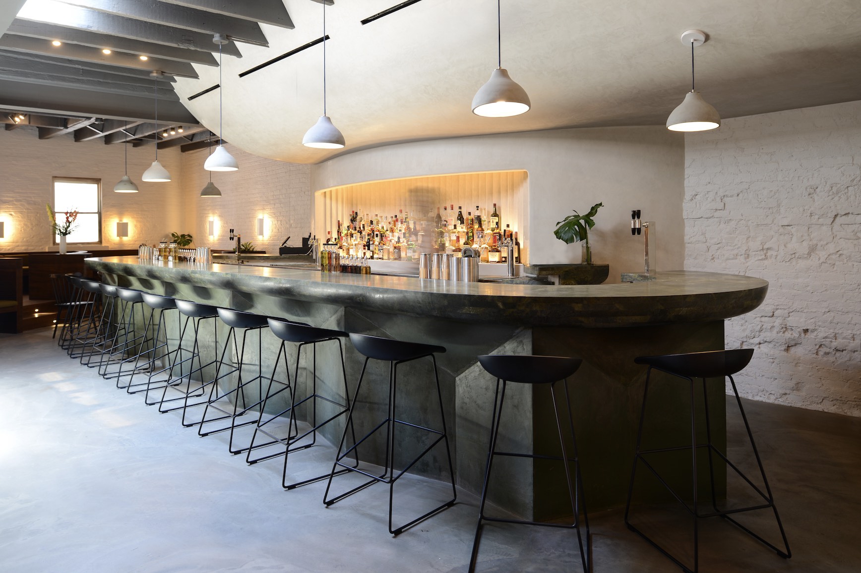 The work of Greenpoint design studio Isaac-Rae further elevates the female-run cocktail bar and restaurant. Bar Beau is design-forward where curves are an aesthetic theme; there’s the sloping path that leads from the entrance, the bending bar that hooks at an end, the rounded bar stools and chair backs that tuck in the guests. It all feels like a chic embrace, a warm hug you happily accept even on the muggiest of summer evenings.