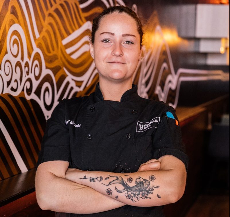 Chef Brooke Apfelbaum: During the pandemic, I was applying everywhere and I applied to this place called La Margarita Pizzeria and that’s how I found out about Chiwa and Spencer, my owners. I ran that place for a year and a half during the pandemic and the landlord raised the rent, so we had to come up with an idea, so with my background of being an actual chef and not just being a pizza chef, I was just like, “Why don’t we open up a restaurant?” And so we came up with this noodle concept because I started doing at-home noodle kits at the pizzeria, and that was a big hit. So then we expanded that idea into finding an actual place where we can actually do noodles.