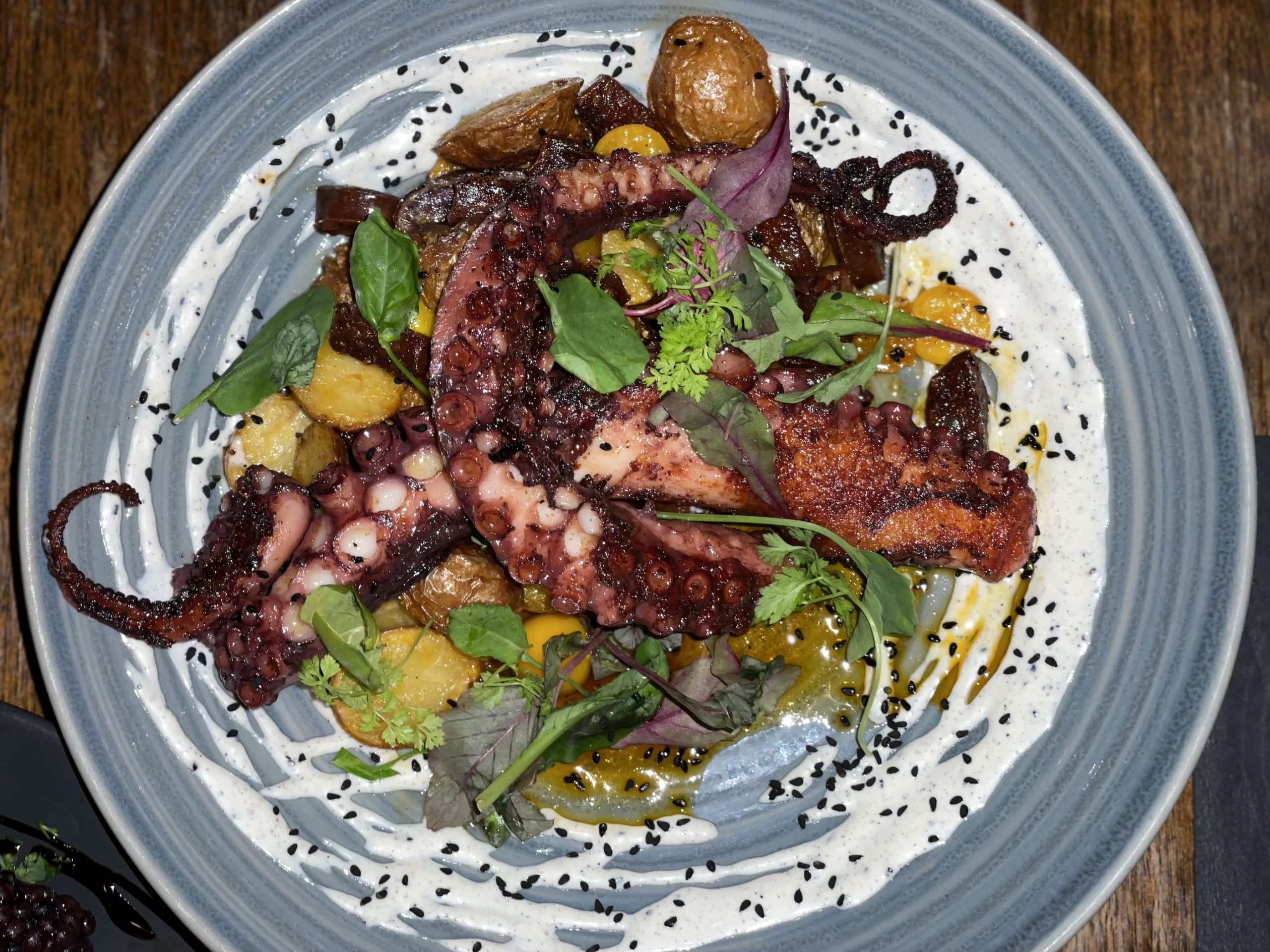 Ten Hope’s Chef Travis McGinty makes a delicious octopus dish, served with rainbow potatoes, cured chorizo, and nigella aioli, and has shared the recipe with us for this week’s edition of our Community Cookbook.