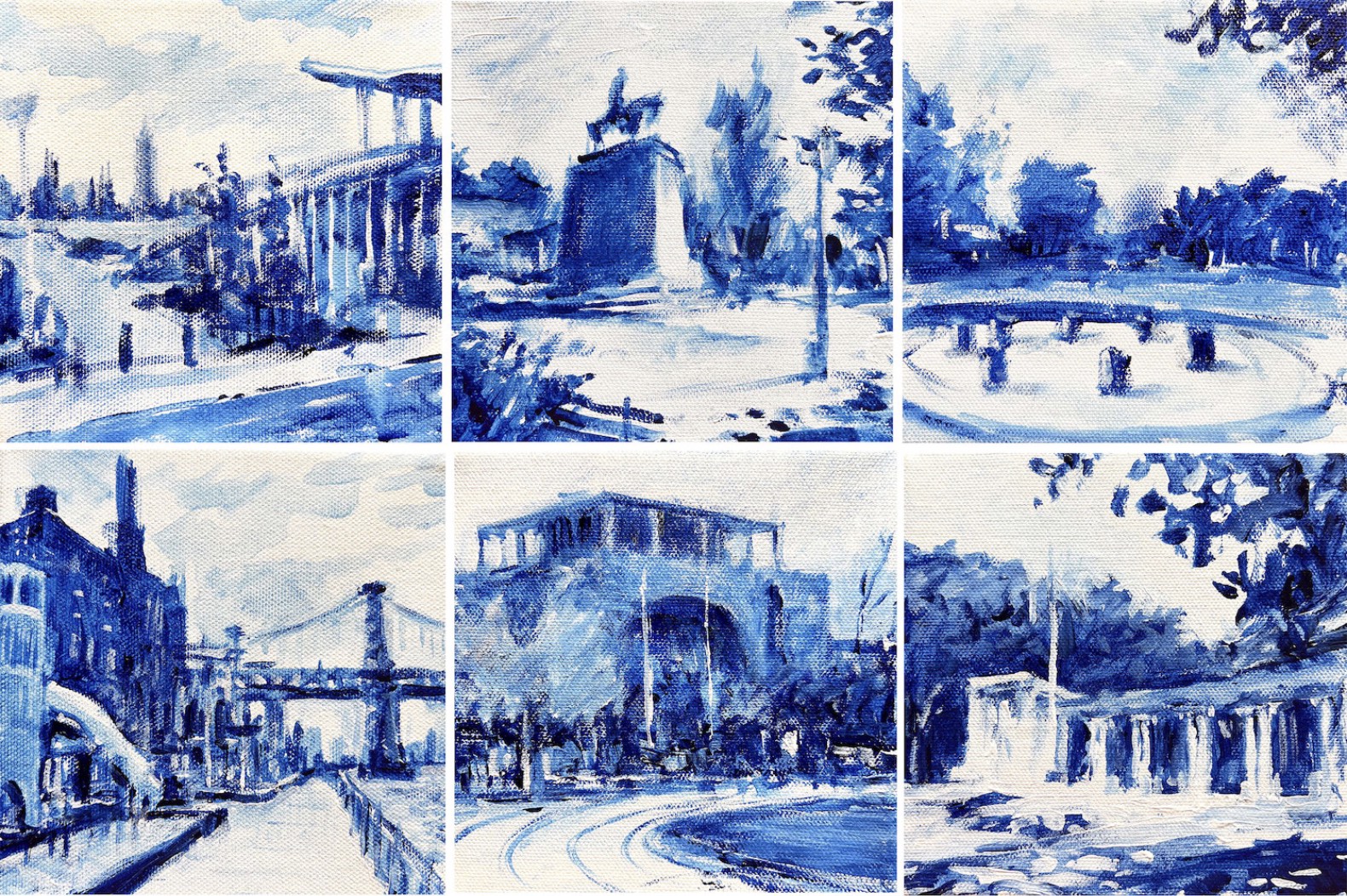 “Wasterval painted these green spaces on-site en plein air, rendering each in his distinctive impressionist style with a porcelain-inspired blue and white color palette that recalls Dutch tiles,” the campaign’s website reads.
