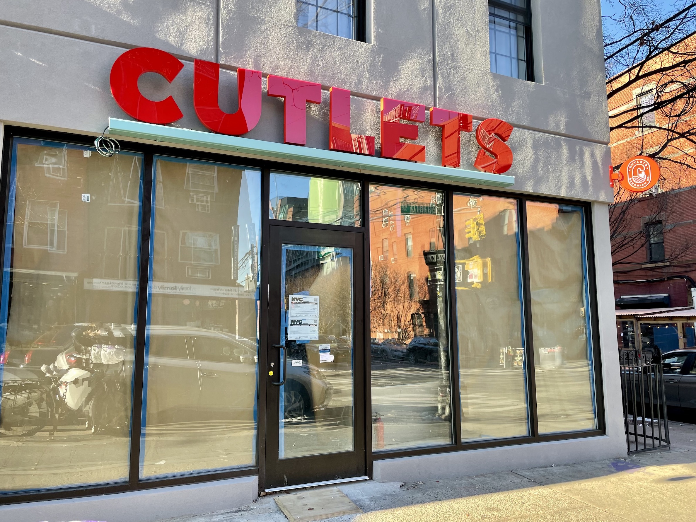 The Williamsburg location of Cutlets at 126 Bedford Avenue is not happening for the time being. Bright red signage outside the corner lot has been up for a year, however, an eviction notice on the door was recently spotted, prompting locals to give up hope.