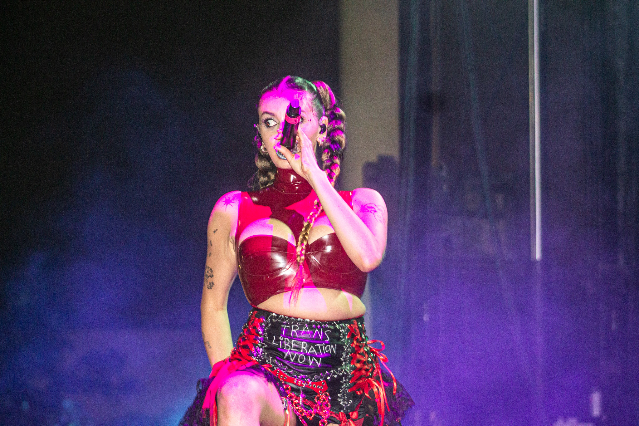 “Do you know what day it is?” asked Rebecca Black on a Friday night, kicking off Pride weekend, underneath the Kosciuszko Bridge in Greenpoint. Protected from the constant rumble of traffic and wearing a leather-black miniskirt that read, in clear hand-stenciled letters, “Trans Liberation Now,” she ended her opening set at LadyLand with a euphoric, reinvented hyperpop version of “Friday” that bounced and ached gleefully in the night air.