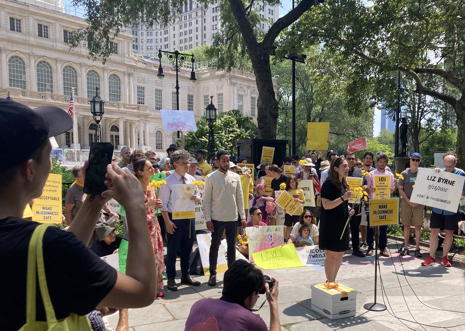 A lone heckler temporarily halted the day’s proceedings, interrupting Antonio Reynoso, though the crowd eventually drowned him out with a chant of “Safe streets now!” The heckler continued to yell through a megaphone for the rest of the event.