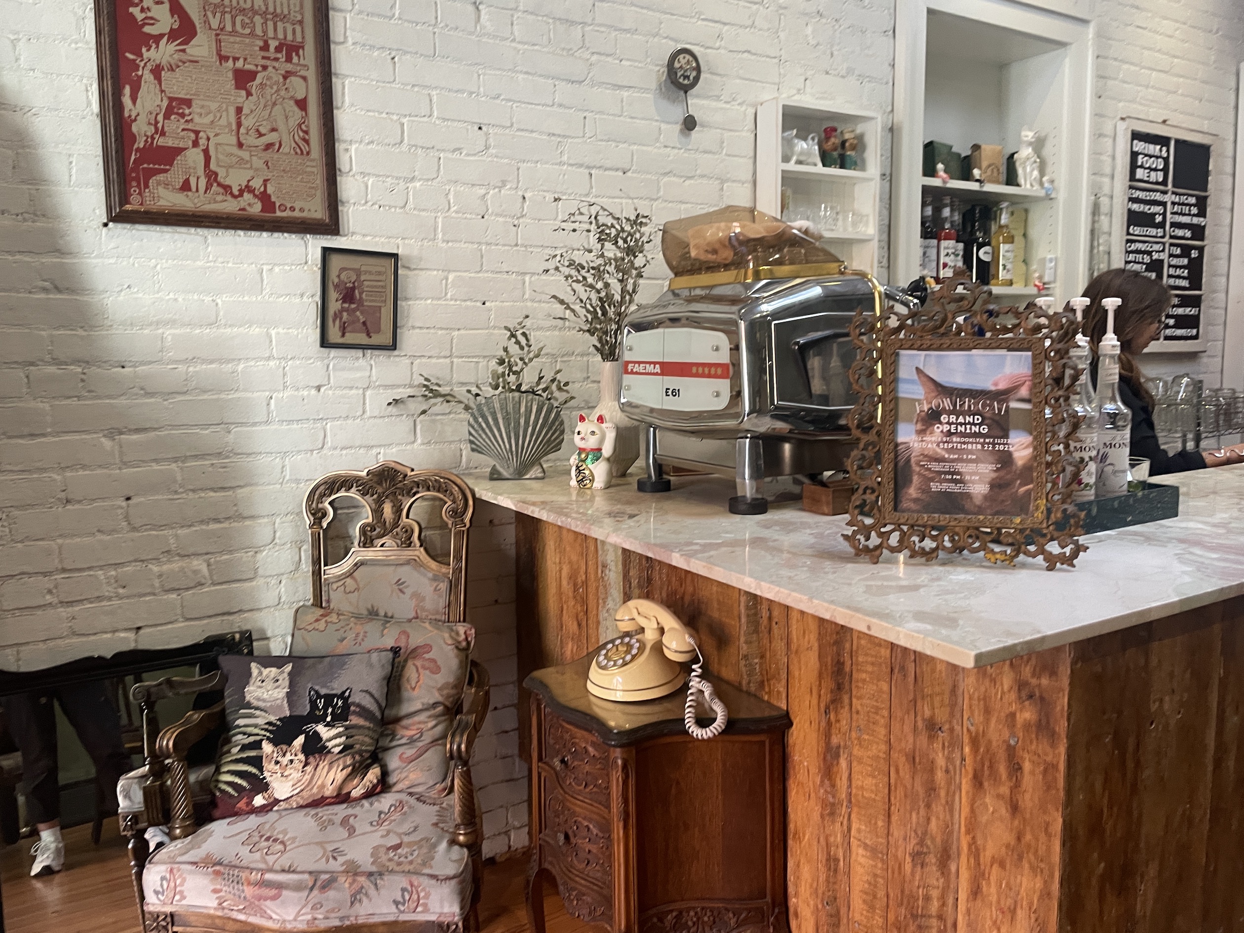 The goal for Flower Cat is to keep community connections going, from a grand opening performance from the Greenpoint String Quartet to ideally collaborating with Greenpoint Cats and other rescues on a specialty drink with proceeds helping their cause. Other physical goals include filling up the whole gallery wall, including grab-and-go flowers, creating astrology-inspired bouquets by sign, and utilizing a bit more outdoor space. And, of course, always leaning into the cat theme.