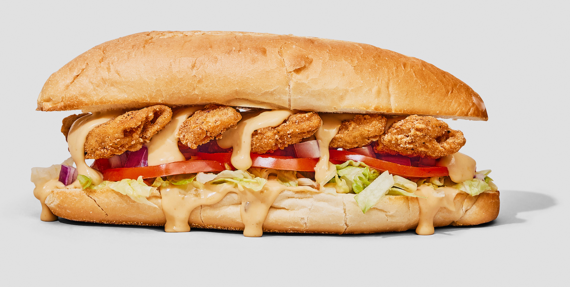- Add the lettuce, tomato, and onions, followed by the fried chicken tenders.