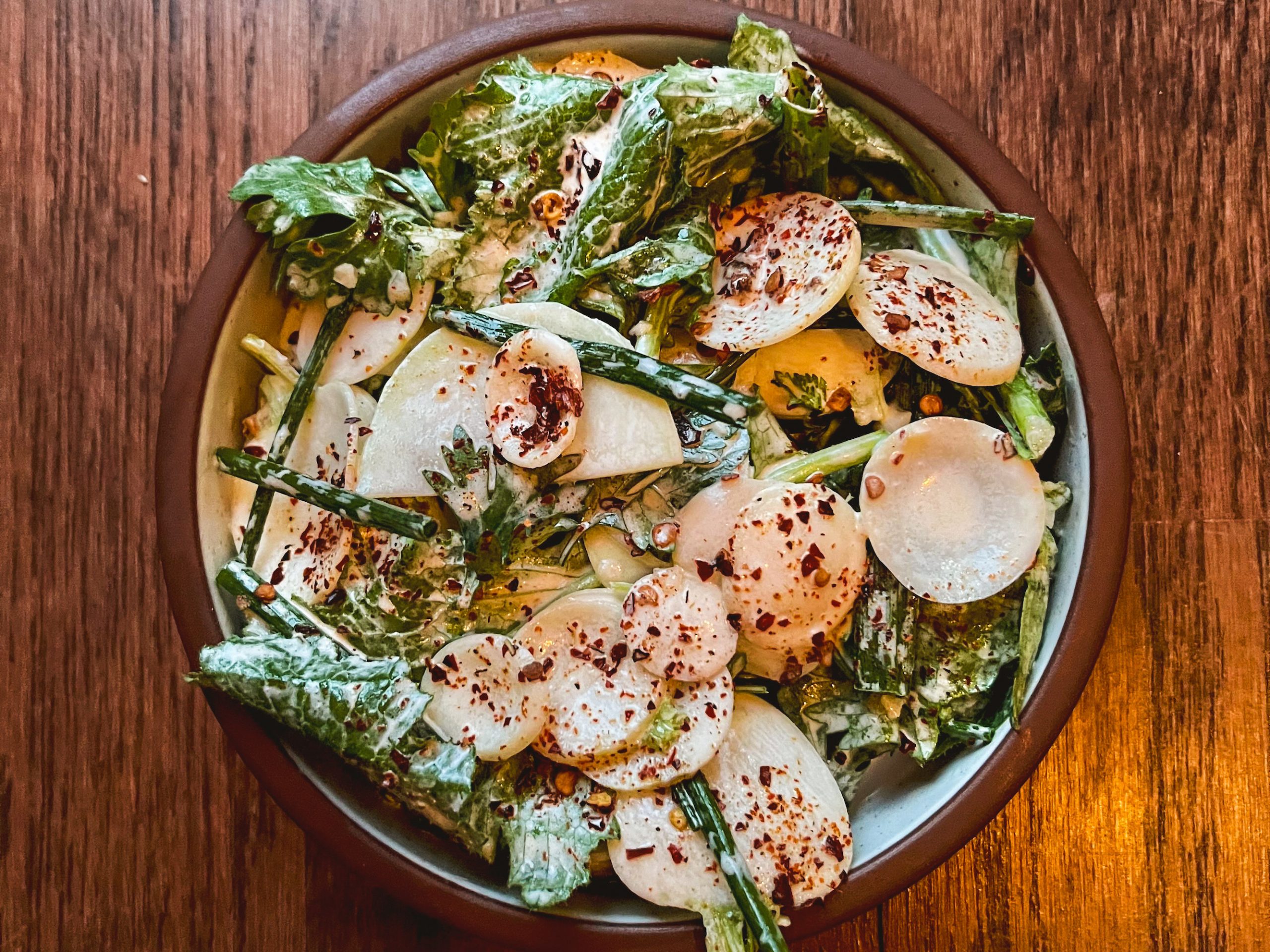 Chef Frieling has shared his recipe for Tokyo Turnips, one of the signature dishes currently featured on the restaurant’s veggie-forward menu. The turnips are served with kohlrabi salad, creme fraiche, and chili flakes.