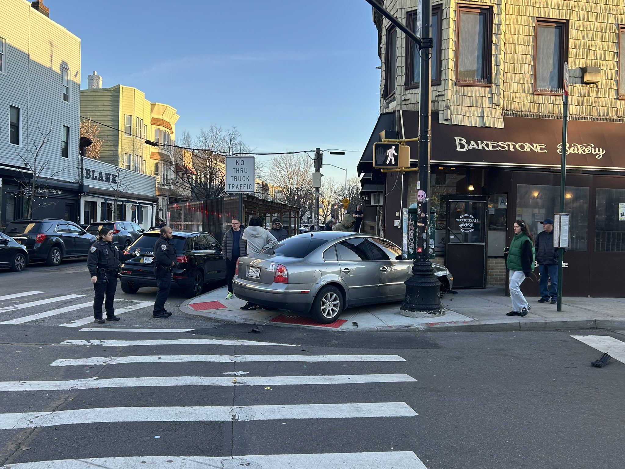 The NYPD made no mention of how a vehicle ended up crashing into Bakestone Bakery. Judging by the photos that the street safety group Make McGuinness Safe posted on social media, it doesn’t look like the bakery was damaged. The photos indicate that a gray Volkswagen Passat is the vehicle that ended up on the sidewalk.