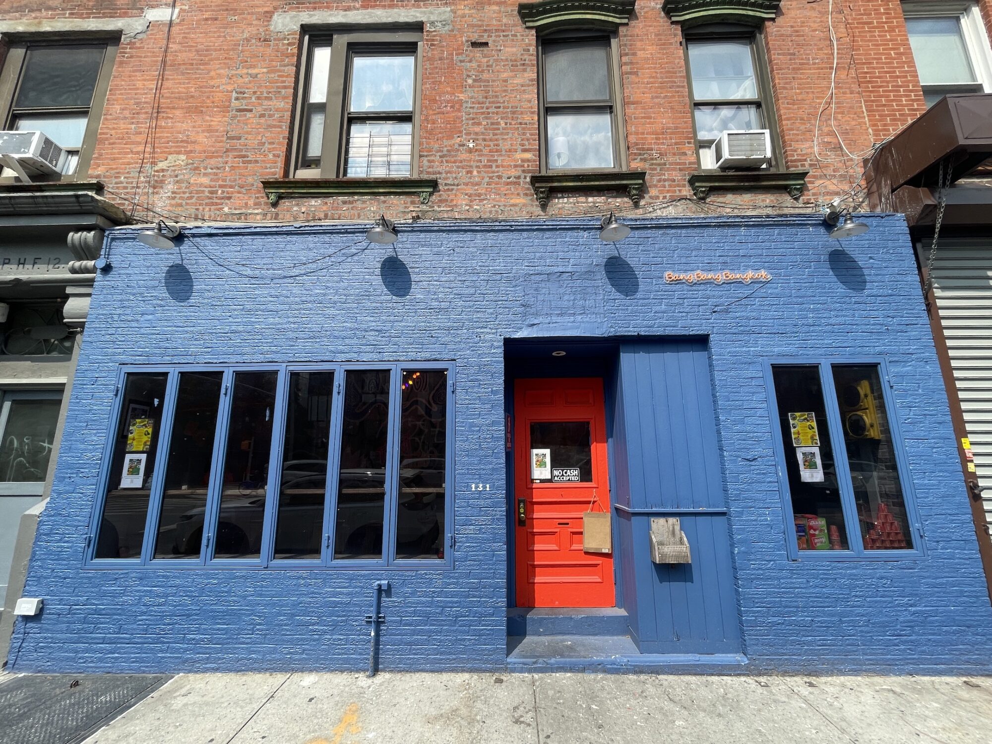 Bang Bang Bangkok opened at 131 Grand Street in late July, taking over from Taqueria Mexico 2000 (which closed over the winter), and completely transforming the space, including an eye-catching cobalt blue exterior and interior dining room designed to look like you’re in a moving bus.