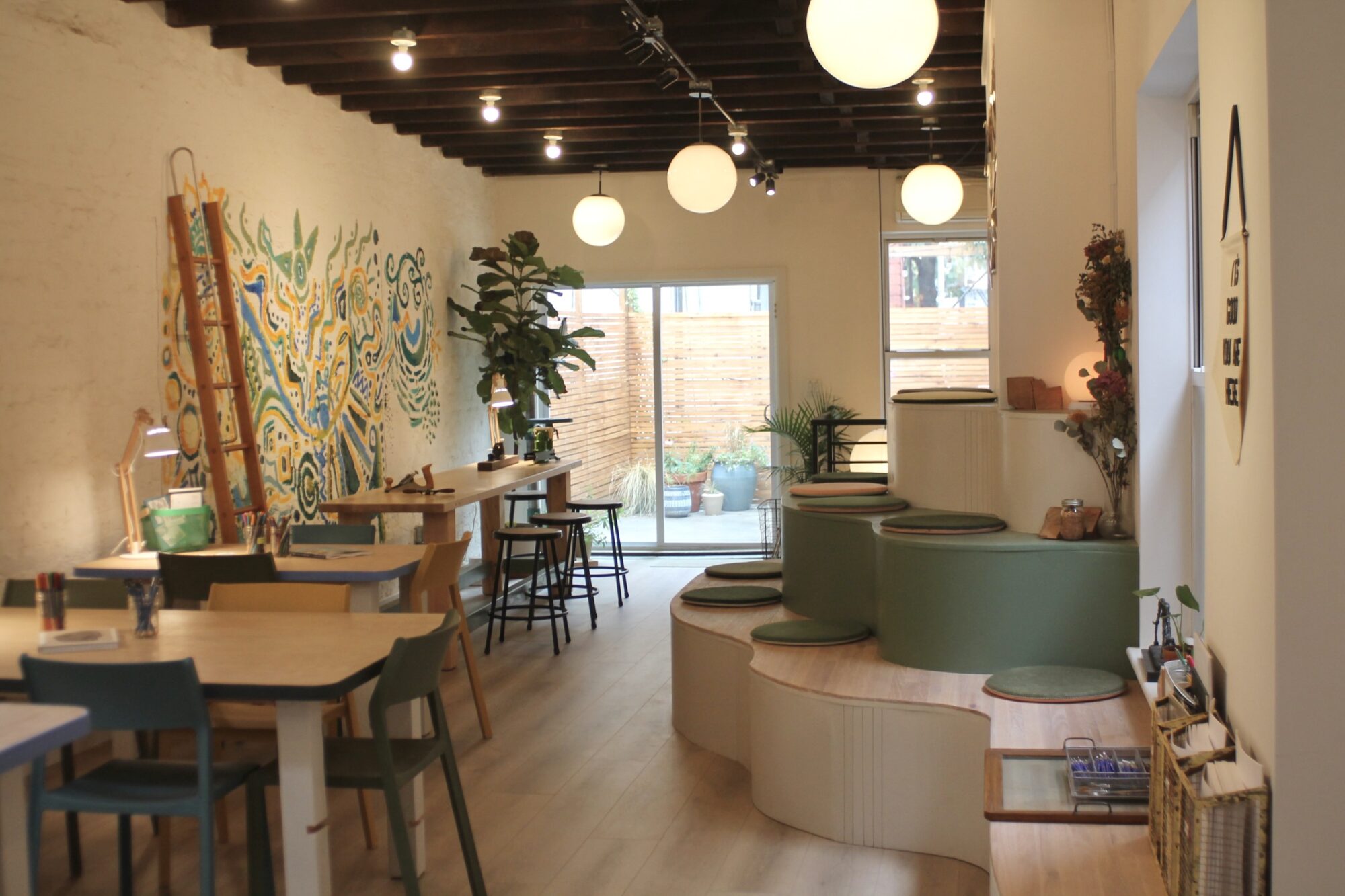 The space itself — tucked next to Rockin’ Locks Salon for Kids and just a stone’s throw from St. Mazie and Gertie’s — has been its own art project of sorts for Spellman, Wheeler, and Belaief, who’ve done nearly all of the woodworking (including the curved counter cut from an ash log and tables made by Wheeler), tiling, and decorating by hand, with many fixtures found secondhand or via stooping.