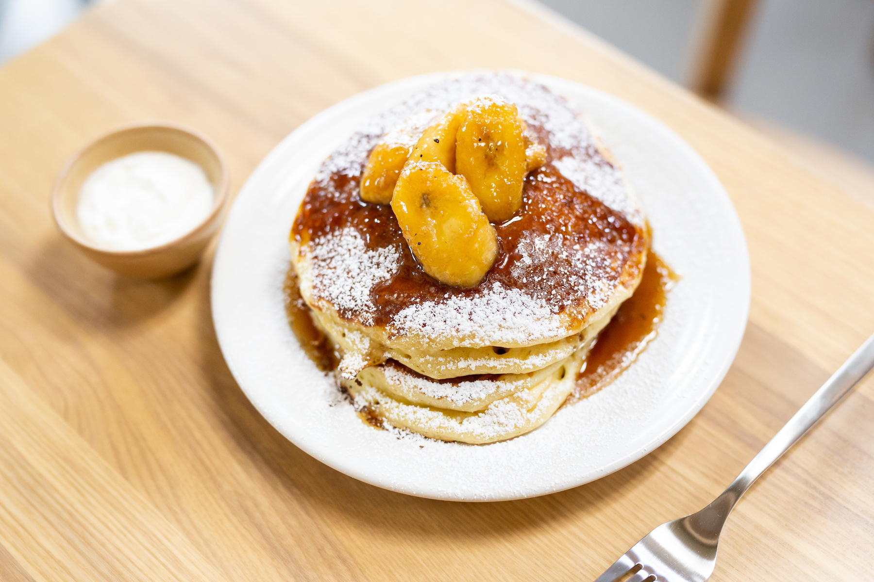 - Serve pancakes with your choice of toppings. Examples include sautéed bananas, blueberry compote, maple syrup, butter, or Nutella.