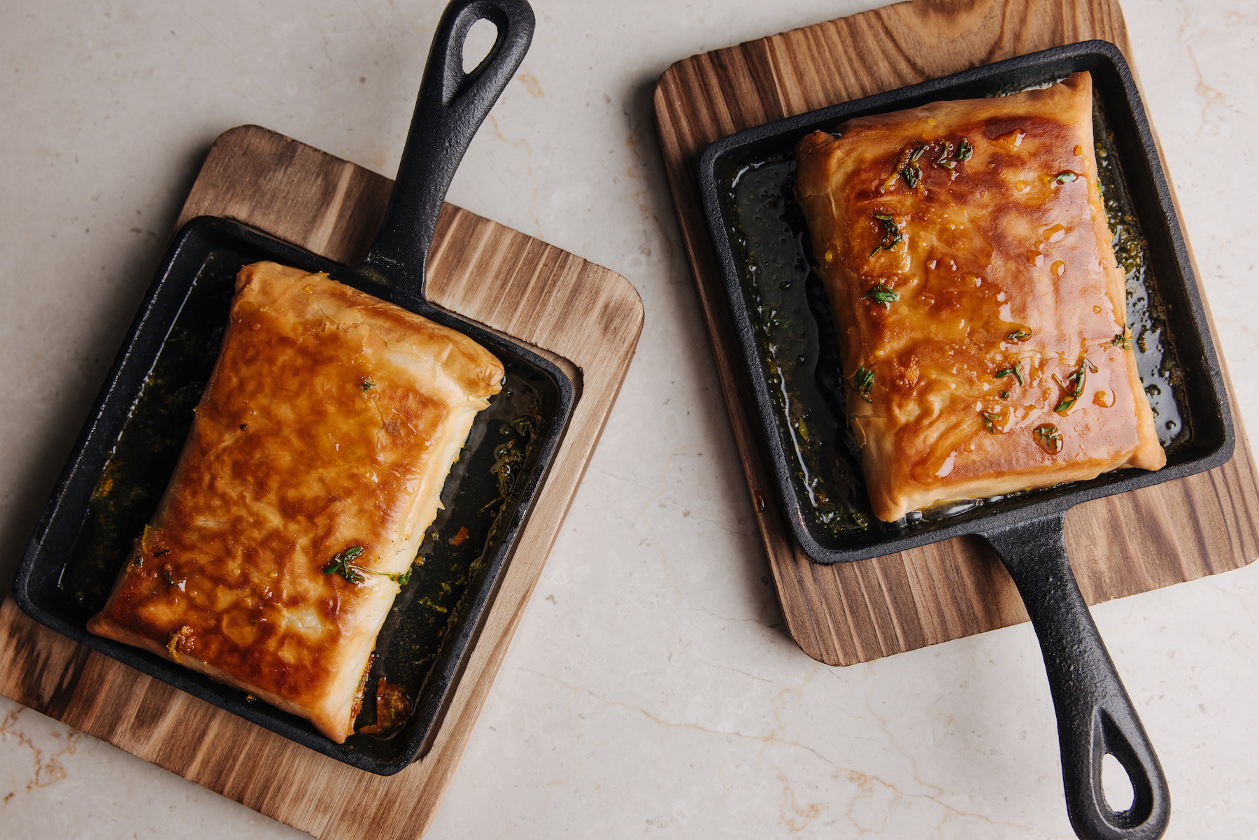 - Remove the saganaki from the oven and garnish with pieces of thyme and a drizzle of honey.