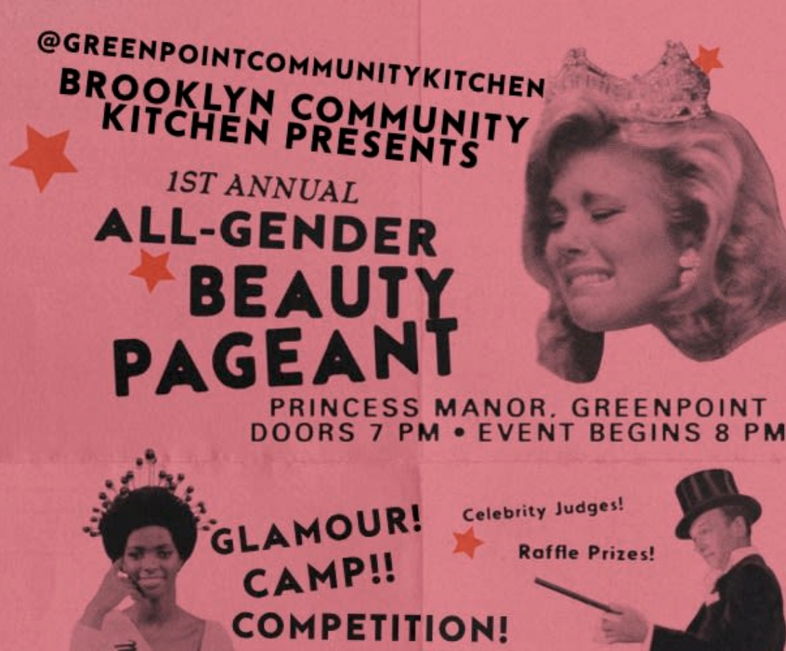 Greenpoint Community Kitchen presents the 1st Annual All-Gender Beauty Pageant, taking place on February 27 at Princess Manor (92 Nassau Ave). All proceeds from the evening will go towards the Greenpoint Community Kitchen, which has spent over 30 years providing free meals to the neighborhood.