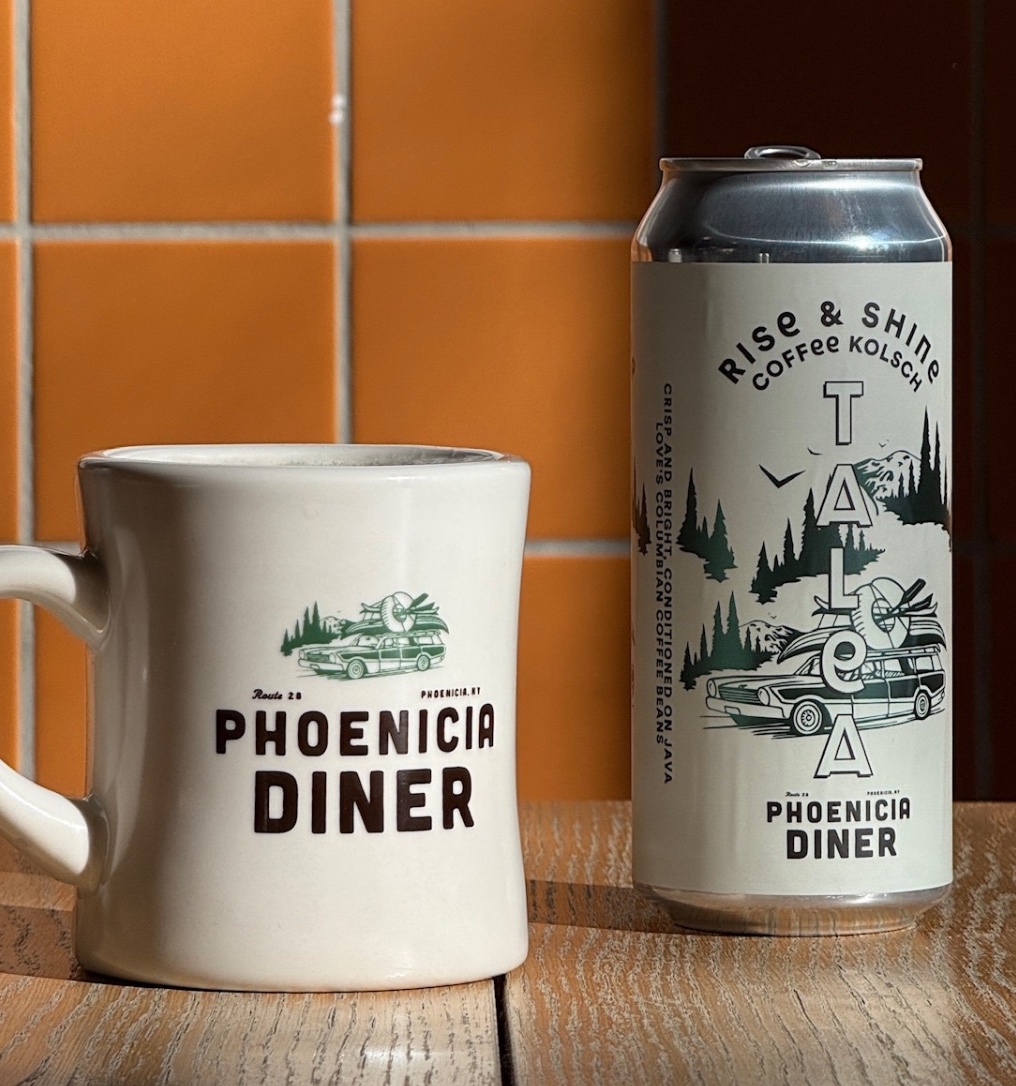 The TALEA x Phoenicia Diner souvenir mug next to their new collab, Rise & Shine Coffee Kolsch. Photo: Corner Table Creative
