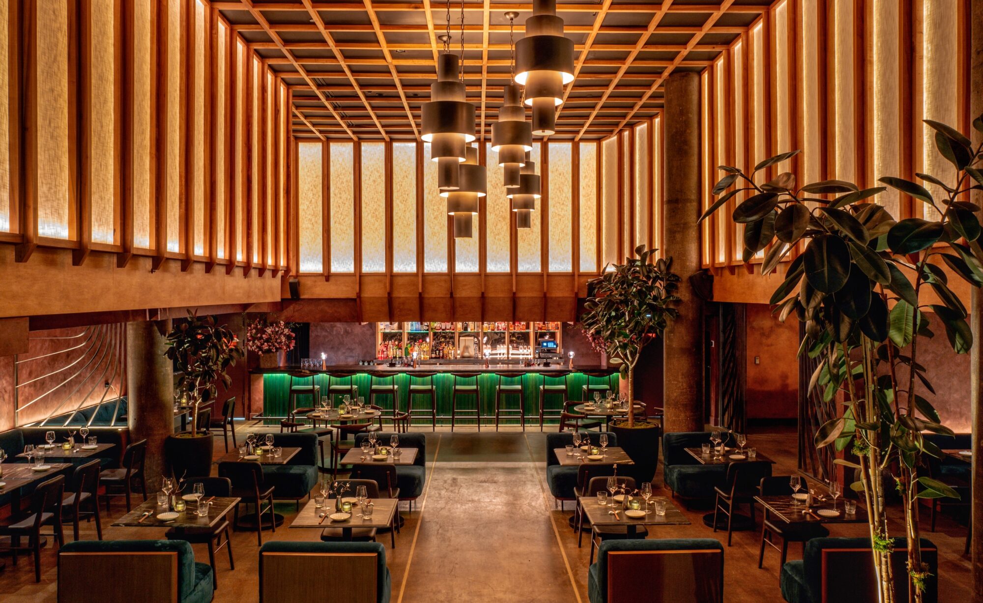 Meili’s elegant dining spaces, designed by MoLiving, include an expansive, high-ceilinged dining room with a long stone bar lining the back wall and a private party room that seats 14. These areas are bathed in rich and moody colors like gold and green, while the entrance features a pair of red mahogany staircases. Other touches of red can be found throughout the space, as a symbol of luck and prosperity.