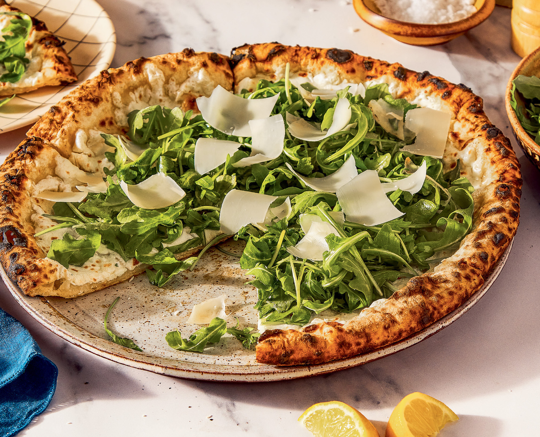 - Remove from the oven and evenly scatter the arugula over the pie.