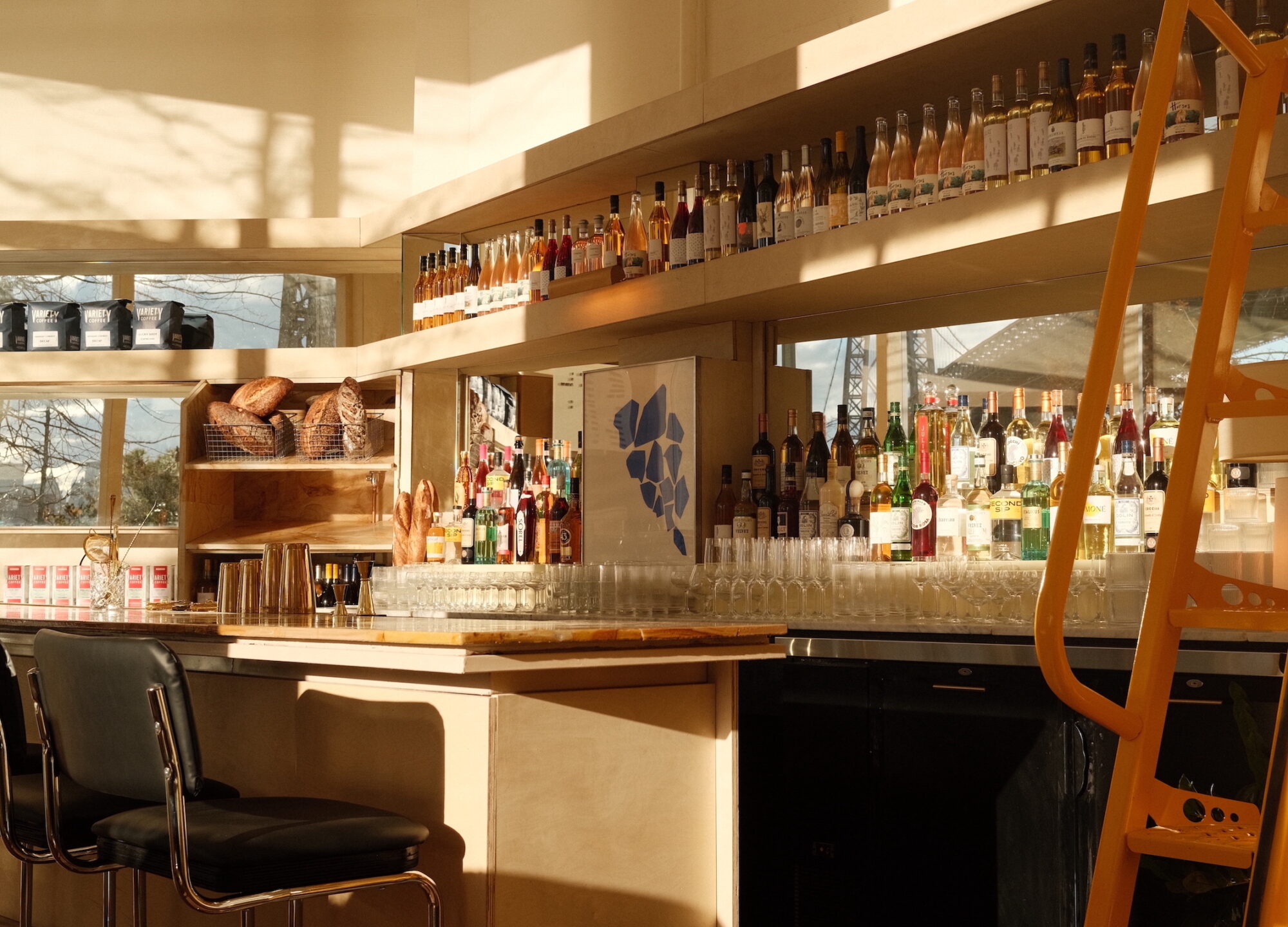 Cafe Susanne features expansive floor to ceiling windows, a 14-seat teakwood stone bar, birch and plywood accents, and antique wood from old bleacher seating. If the airy, coastal vibes feels familiar, that might be because Maddy also designed local favorite Lilia.
