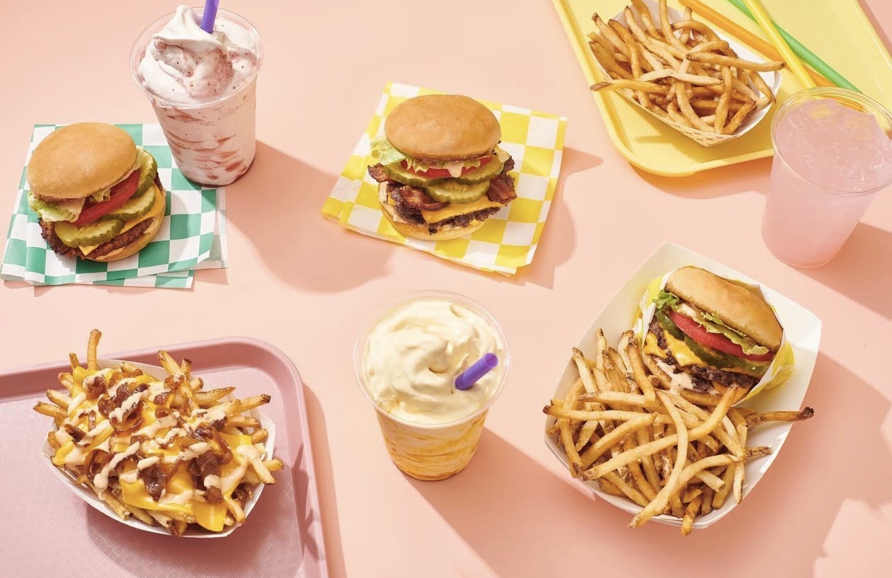 Herbie’s Burgers’ menu includes its signature smash burgers made with 100% grass-fed beef patties or vegan patties, plus chicken tenders, vegan tenders, a chicken sandwich, and fries. There’s also a long list of sauces for dipping.