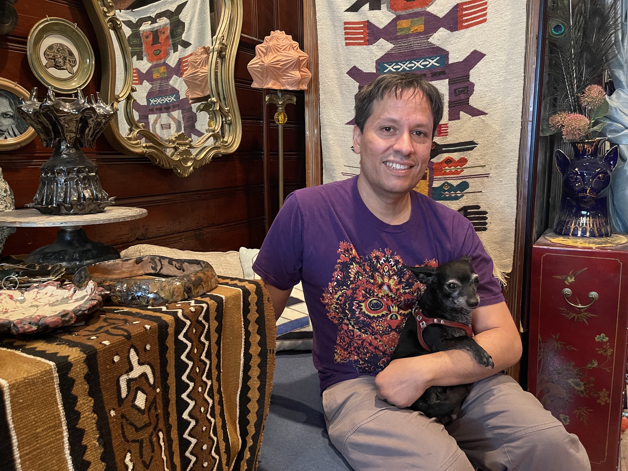 Artist Edwin Vera and his little art assistant, Penny, in his Greenpoint studio. Photo taken by Demetria Osei-Tutu.